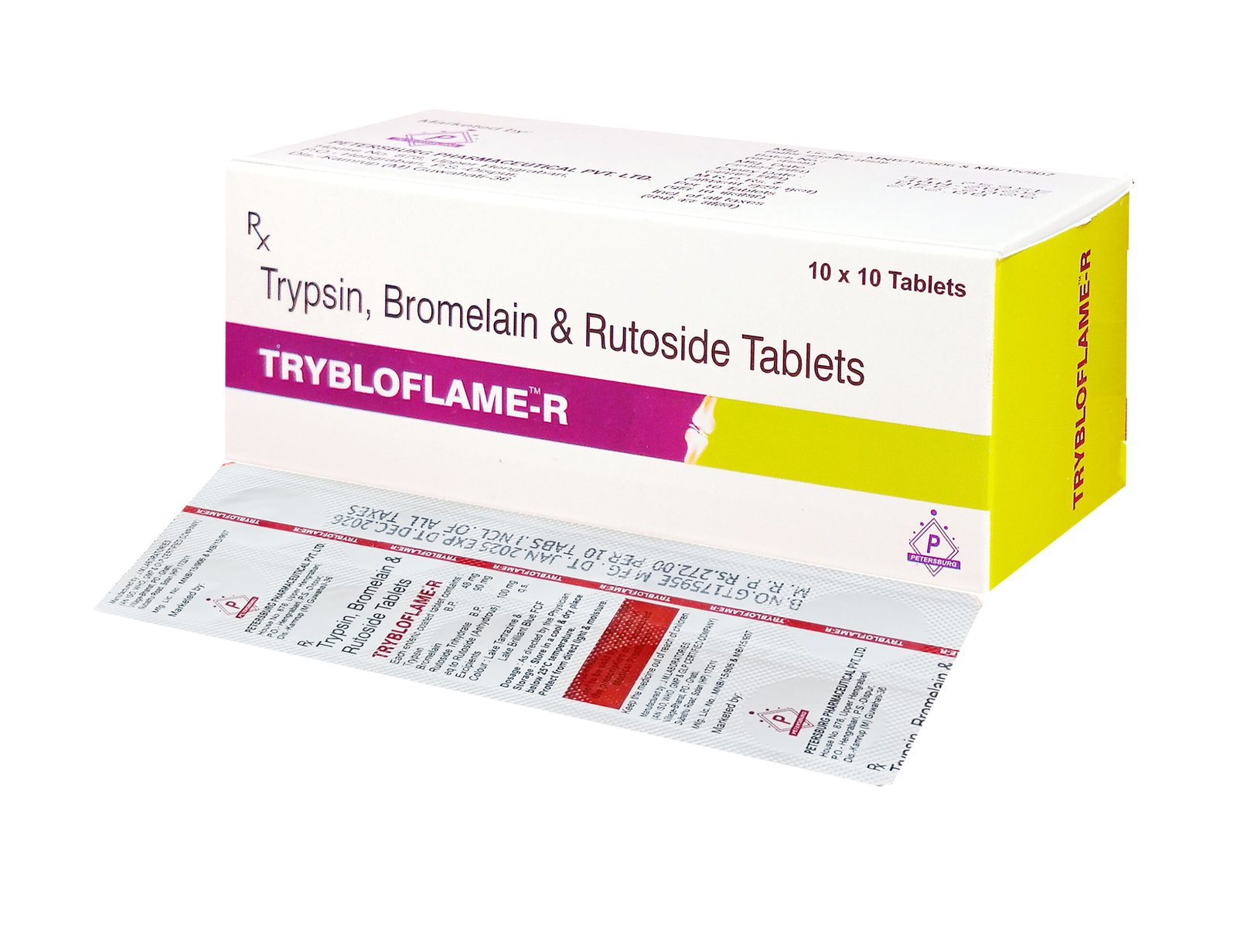 TRYBLOFLAME-R is a scientifically formulated pain relief and anti-inflammatory medication from Petersburg Pharmaceutical Private Limited. It combines the potent benefits of Trypsin, Bromelain, Rutoside, and Diclofenac, making it highly effective in managing musculoskeletal pain, joint inflammation, post-surgical recovery, and sports injuries.